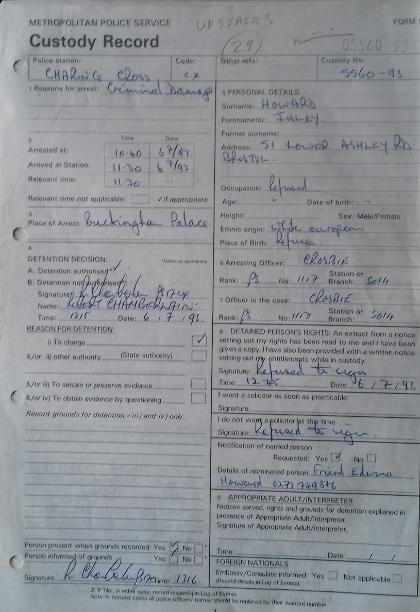 Custody Record, Charing Cross Police Station, 6th July 1993